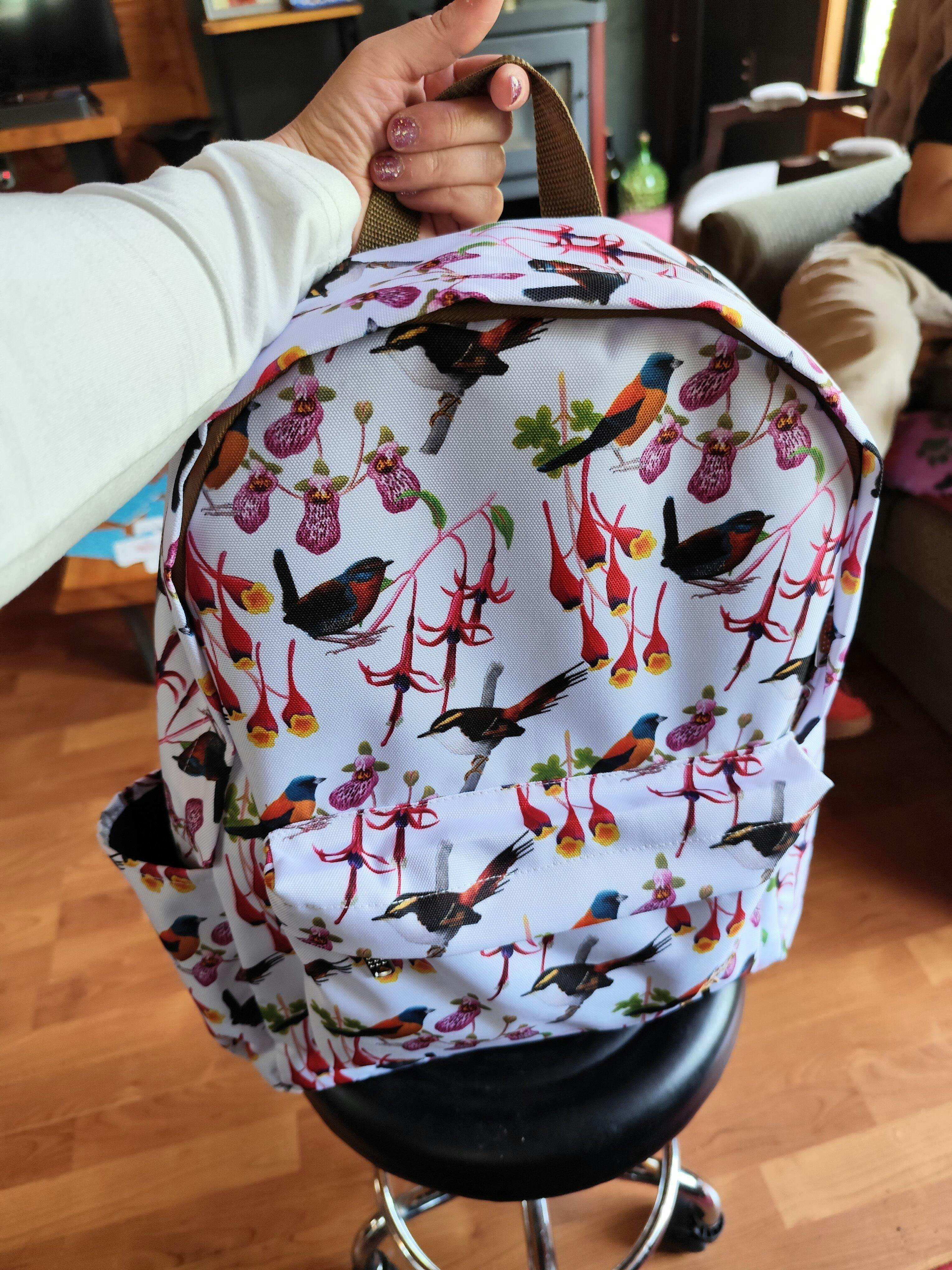 Me encantó la mochila aún más en persona. El fondo es más un color lila clara que blanco lo cual felizmente me sorprendió. Se nota que está bien hecho y cabe mi Notebook perfectamente. Mi botella de agua no cabe pero es porque es una ancha. Me encanta como la correa para agarrarla va por los tirantes. Así no se romperá y los tirantes quedan reforzados también .