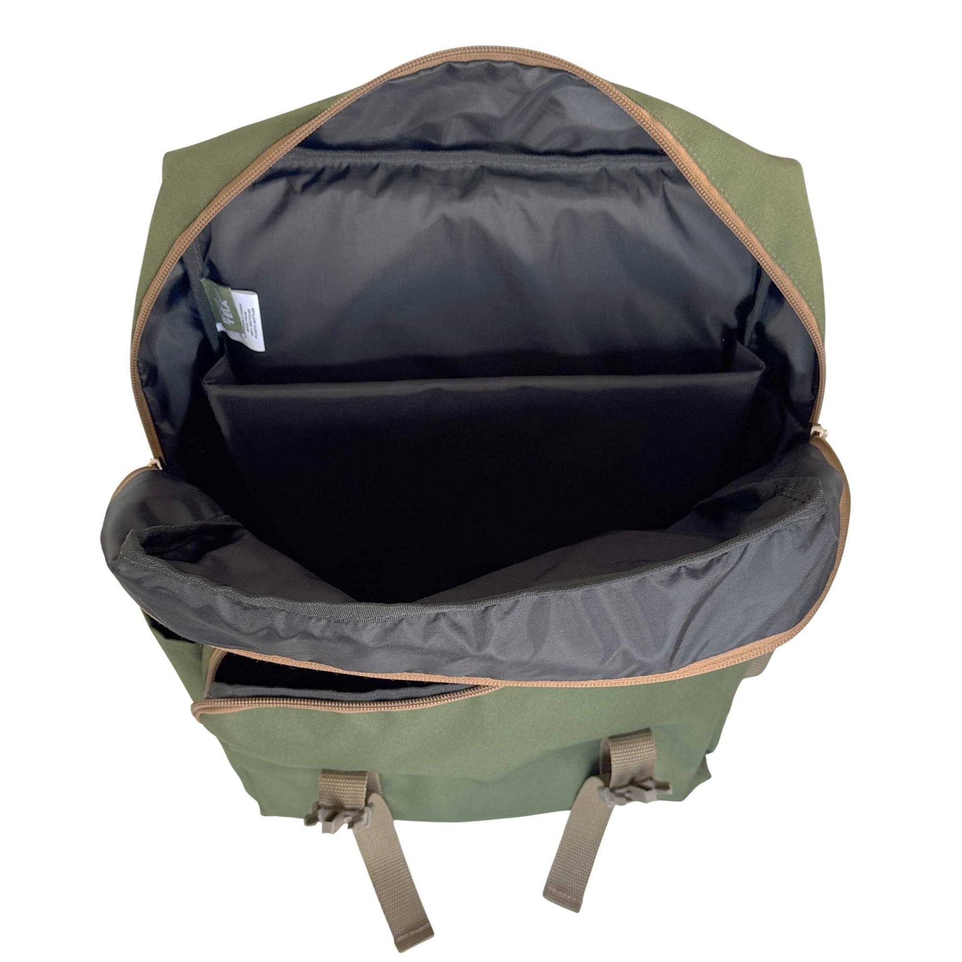 Hecha con tela sustentable, hecha a partir de botellas plásticas recicladas y con tela impermeable